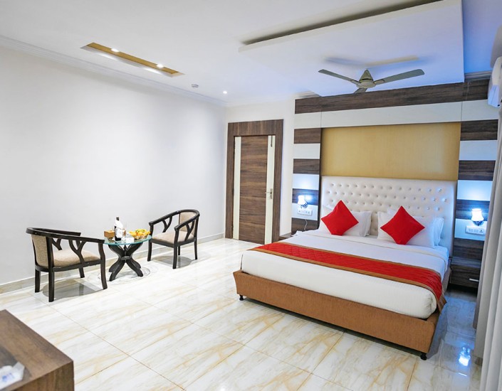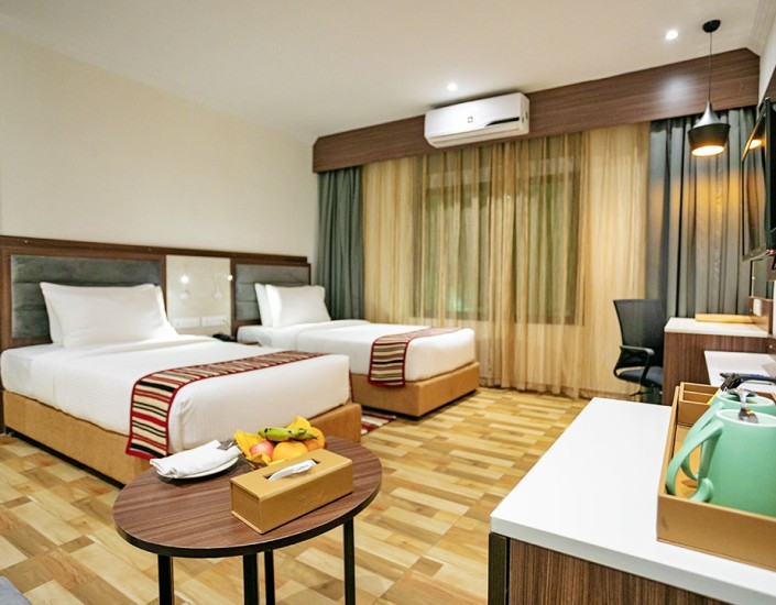 All of our deluxe rooms feature ultimate comfort and convenience, equipped with modern amenities like coffee/tea maker, safe box, attached bathroom, our deluxe room delivers tranquility and elegance which makes you feel at home. These rooms have a comfortable large bed with well-furnished furniture and floors.